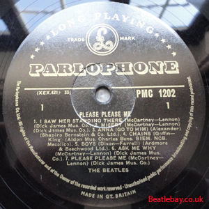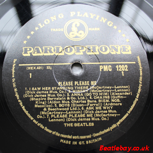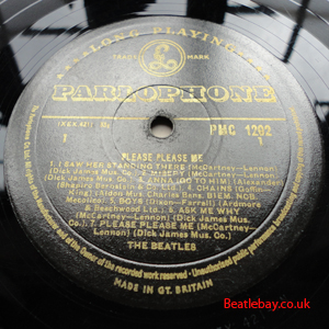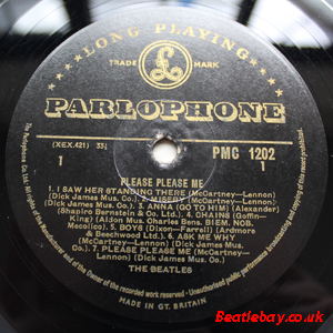 With these all these 1st pressings, there are at least 2 label textures from matt to glossy and 7 pressings with three text label changes per se!. Gold 1st pressings had "Dick James Mus.Co." printed after all 8 of the songs the Beatles had written, and along with the other 6 songs that were written by other artists, make up the 14 tracks on this LP.