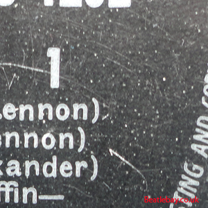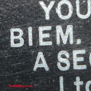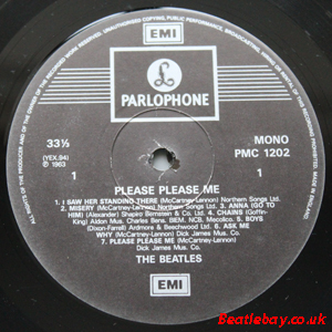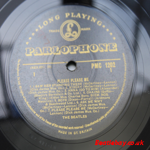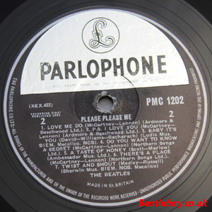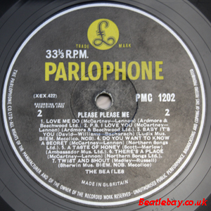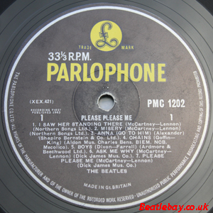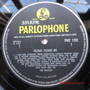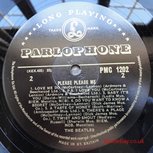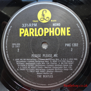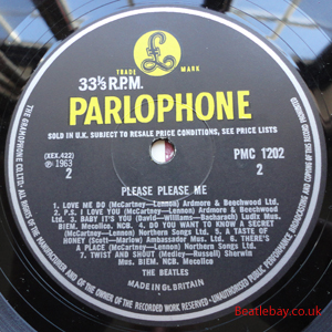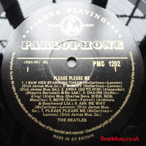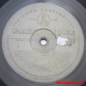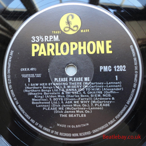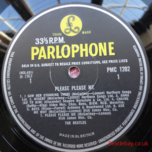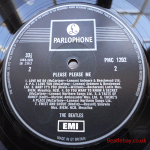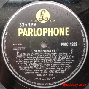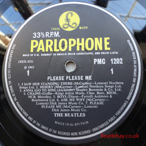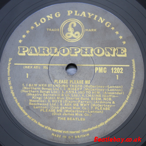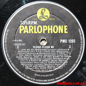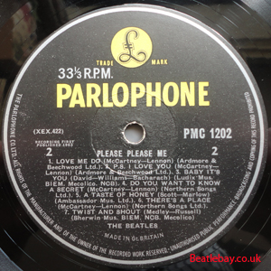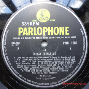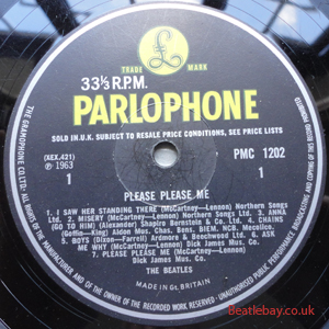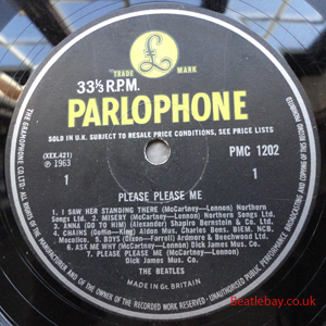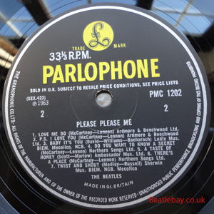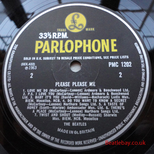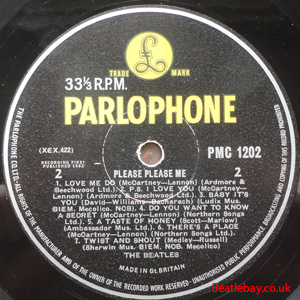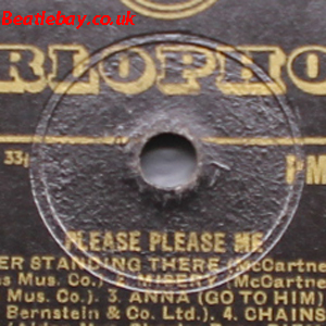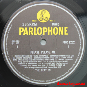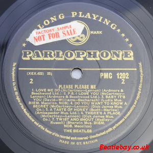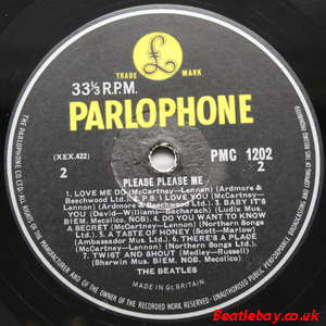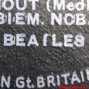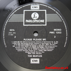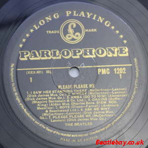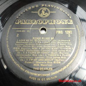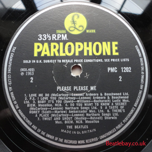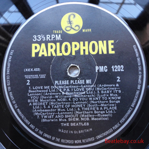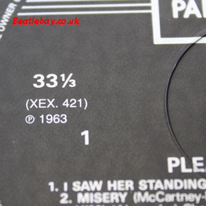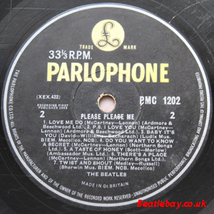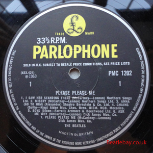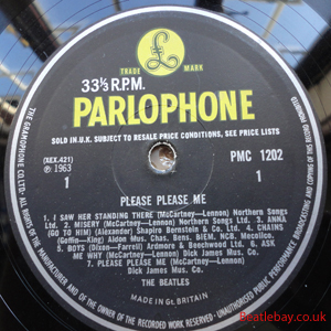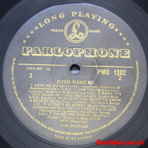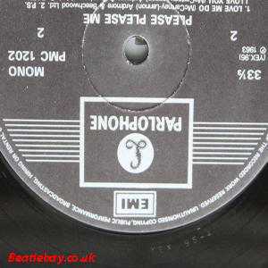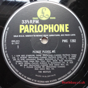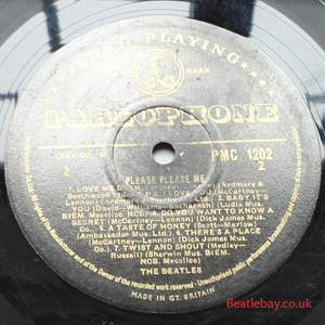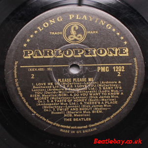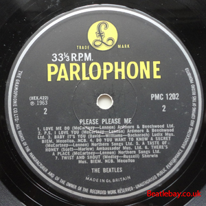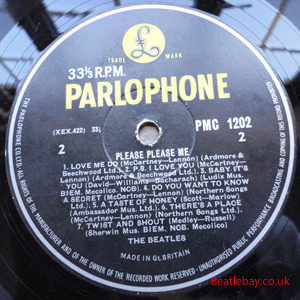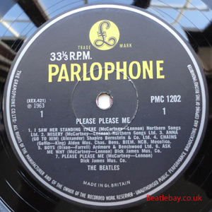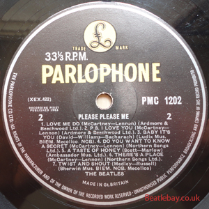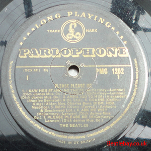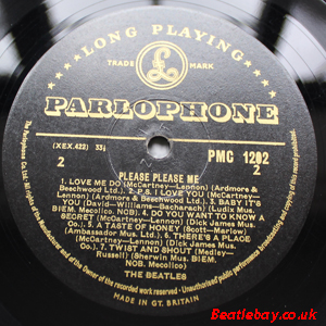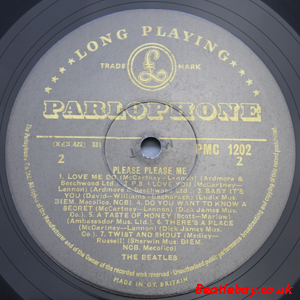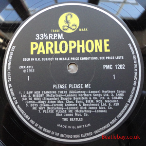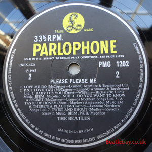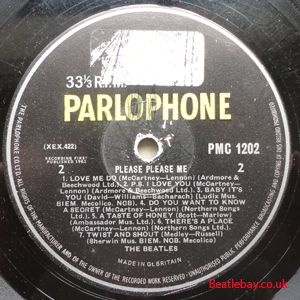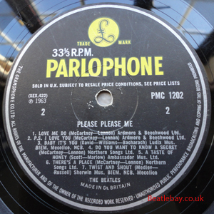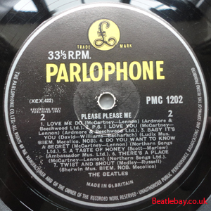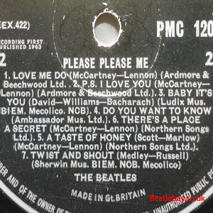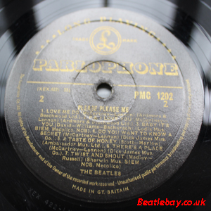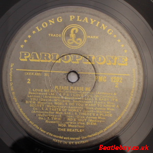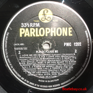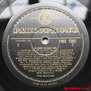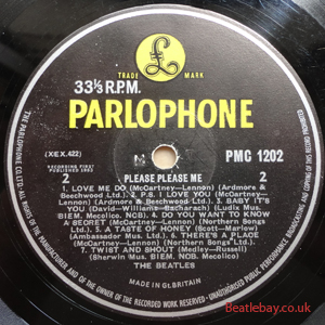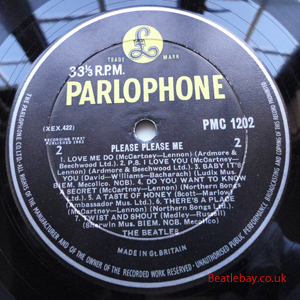 As this first run progressed, the side 2 label started slipping (down?) and became uncentred. This makes sense if the very first ever pressing had the printing error, and as the print ran, the error became less pronounced as the label slipped more and more! Interesting to note, the WOTZ tax code was never pressed on the newer (60,s) G.R.A.M.O.P.H.L.T.D coded LP machines, though it has been seen on a few runs of Love Me Do on the red label 45 pressed on a SP (Single Play) machine in 1962. |